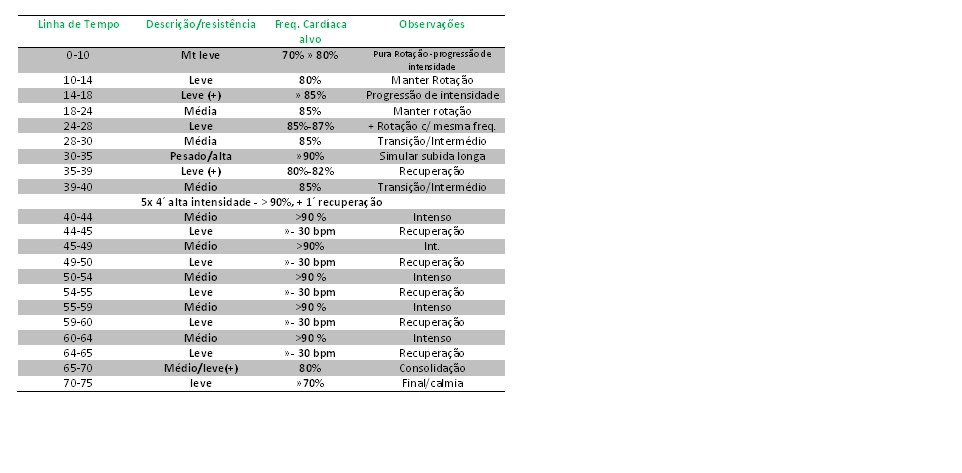 Não esquecer que o treino em questão (spinning) pode ser bastante duro quando levado a sério, pois é bem fácil alcançar as frequências cardíacas desejadas e/ou fazer jogos de alteração de ritmos (+leve,+pesado,sprints, pura rotação,simular subidas, etc...).