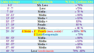 | Inicio: 10´corrida/passadeira ou elíptica + 5´aquecimento específico muscular Final: 10´-30´corrida/passadeira, elíptica ou spinning- ritmo aeróbico. |